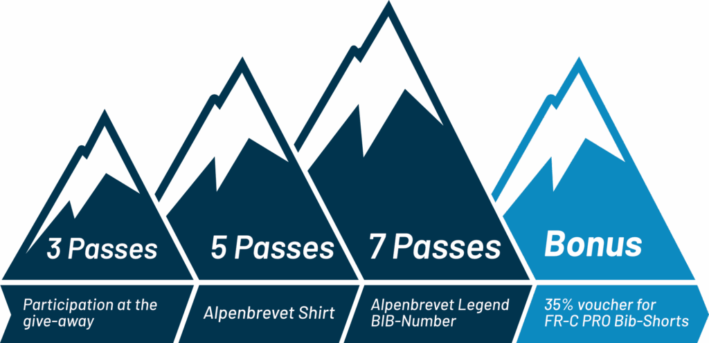 With every alpine pass you ride, you get one step closer to the Alpenbrevet Legend. On the way there, you can win attractive prizes and gifts with just 3 and 5 passes.